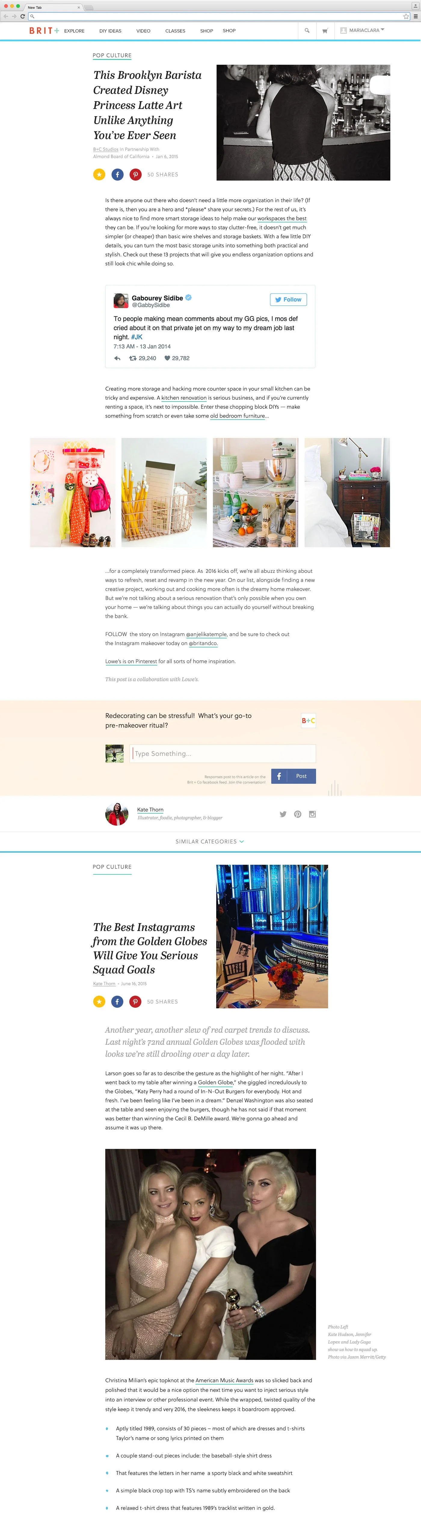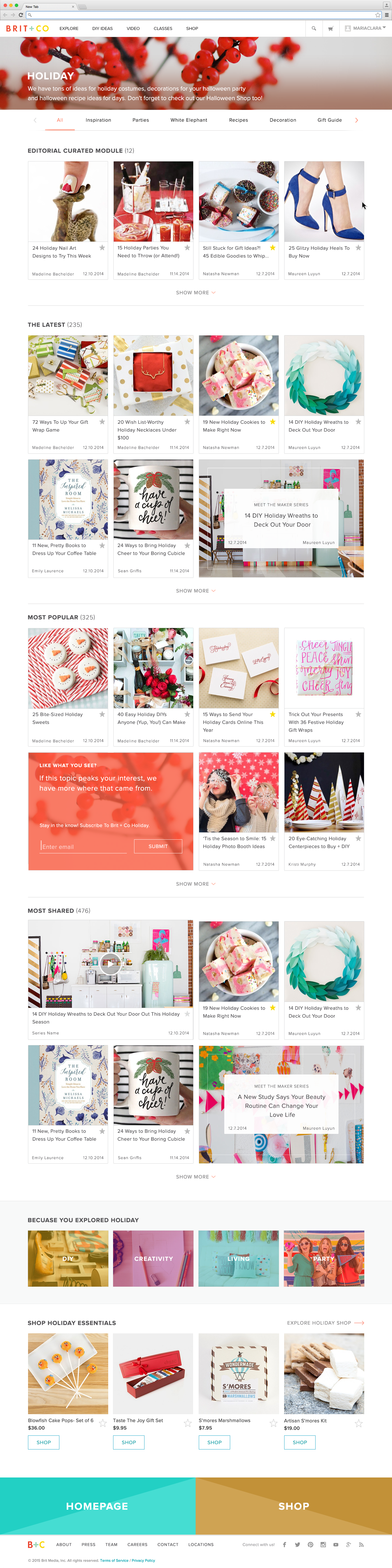 While I was no longer with the company to oversee QA, final implementation or success metrics, I have been delighted to see that a good number of the final design concepts were worked into the homepage that is currently live on Brit + Co's website (7/31/17).